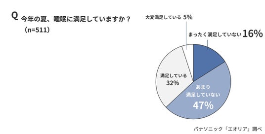 まずはじめに、今夏の睡眠満足度について調査したところ、「まったく満足していない」16%、「あまり満足していない」47%と63%が満足していないことがわかりました。