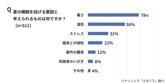 続いて、夏の睡眠を妨げる要因をたずねたところ、「暑さ」78%、「湿気」56%、「ストレス」31%が上位の回答になりました。