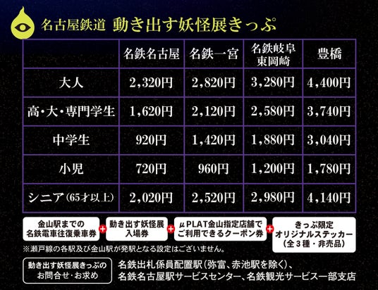 金山駅までの名鉄電車往復乗車券、動き出す妖怪展の入場券、μPLAT金山指定店舗でご利用できるクーポン券に、きっぷ限定オリジナルグッズが付いたお得なきっぷが発売。