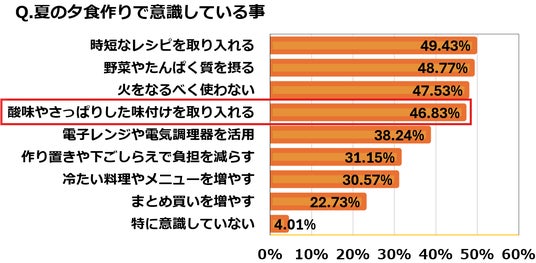 弊社のお客様向けのアンケート結果によると、夏の夕食作りでは、「時短」や「野菜・たんぱく質をとること」、「火をなるべく使わない」にほぼ並び、「酸味やさっぱりした味付け」を、それぞれ約5割の方が意識していることが分かりました。また、夏に使用頻度が増える調味料においても、めんつゆにつづき、約5割の方が酢の使用頻度が増えることがわかりました。これらのアンケート結果からも、夏場はできるだけ調理負担を減らしつつさっぱりしたものが好まれる傾向があることが分かりました。