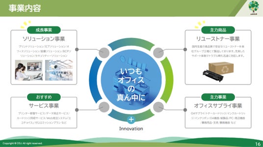 ここ10年ほどはソリューション事業にも力を入れておりまして、物販だけでなくお客様の課題解決型のテーマを重視しています。サービス事業としては、壊れたプリンターの修理や中古プリンター・パソコンの販売、廃棄パソコンの部品再利用など、環境配慮を軸にした取り組みを行っています。