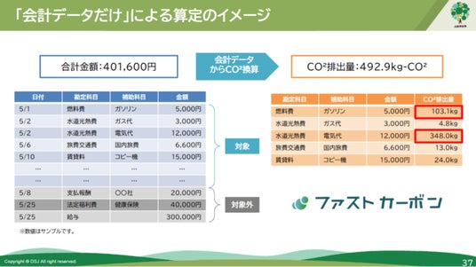 私たちの「ファストカーボン」では、会計データを活用して排出量を算出できます。つまり、勘定科目や補助科目など、既にある経費データをもとにCO2排出量を自動で計算できるというコンセプトです。