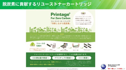 また、「Printage For Zero Carbon」ということで、「印刷しながら脱炭素」というのも弊社のキーワードの一つです。リユーストナーカートリッジ利用者へのステッカー配布や、子どもたちや学校機関への提供を通じて、リユーストナーカートリッジの普及を目指しています。