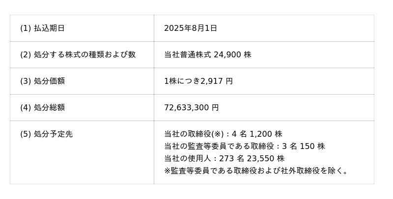 本自己株式処分における処分価額につきましては、恣意性を排除した価格とするため、当社取締役会決議日の直前営業日(2025 年7月9日)の東京証券取引所における当社普通株式の終値である 2,917 円としております。これは、当社取締役会決議日直前の市場株価であり、合理的かつ特に有利な価額には該当しないものと考えております。