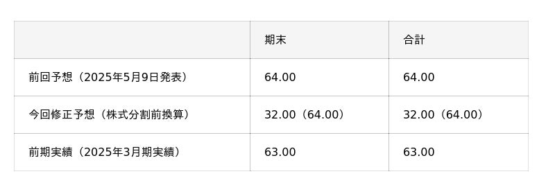 今回普通株式1株を2株に分割することに伴い、2025年5月9日付で公表しました2026年3月期の期末配当予想額を以下のとおり修正いたします。なお、本修正は株式分割に伴う修正であり、前回予想の1株当たりの期末配当予想額に実質的な変更はありません。