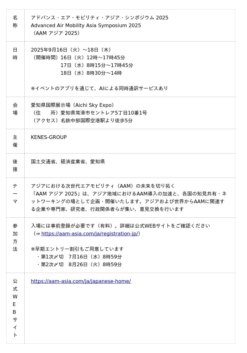 2025年9月16日(火)から18日(木)までの3日間、愛知県国際展示場(Aichi Sky Expo/愛知県常滑市)にて、アジア地域における次世代エアモビリティ(Advanced Air Mobility、以下AAM)の未来を切り拓く国際シンポジウム「アドバンス・エア・モビリティ・アジア・シンポジウム 2025、以下AAM アジア 2025)」を開催いたします(主催:KENES-GROUP/国内PR事務局:株式会社新創社 内)。