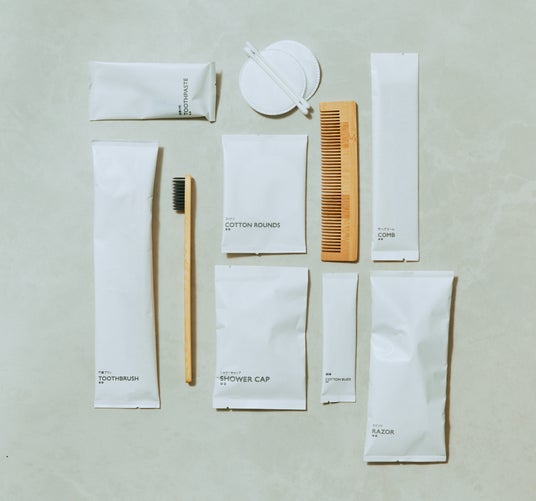 循環素材である竹を使用した歯ブラシ、ヘアコームやパッケージに紙素材を使用したアメニティを8種類以上展開。サステナブルなホテルアメニティの導入をさらに拡大。