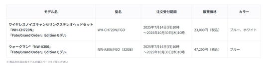 ソニーマーケティング株式会社は、スマートフォン向けRPG『Fate/Grand Order(フェイト/グランドオーダー)』のリリースから10周年を記念し、デザインを選んで刻印できるワイヤレスヘッドホン『WH-CH720N』と、ウォークマン(R)『NW-A306』のソニーストア限定コラボレーションモデルの注文受付を本日7月14日(月)から開始します。あわせて、ソニーストア 直営店舗で店頭体験イベントを開催します。