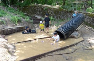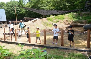 「どろんこ池」 リニューアルオープン 美濃市の県立森林文化アカデミー 滑り台や舟の遊具も