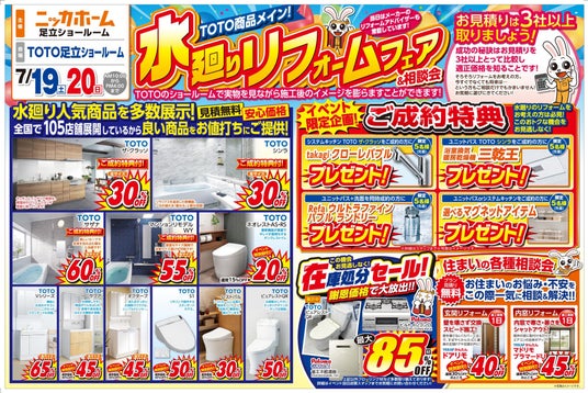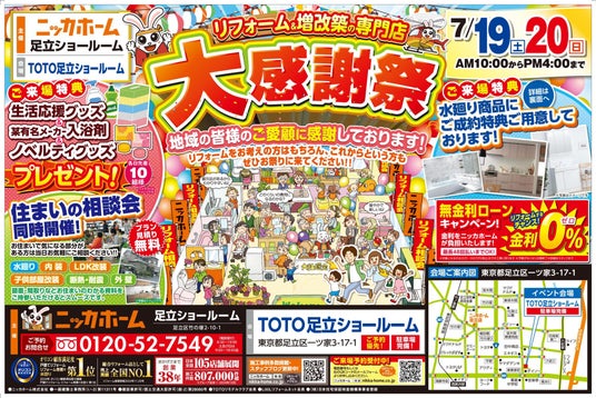 リフォーム大感謝祭・夏の陣!地域の皆さまのご愛顧に感謝し特典を盛りだくさん用意しました!7月19日(土)と20日(日)は、TOTO足立ショールームでお待ちしております!