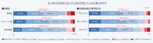 ●IT人材が「不足している」と回答した企業は75.2%、「充足している」は1割強にとどまる●従業員1,000人以上の大企業は79.6%、マネジメント層は79.2%が「不足」と回答