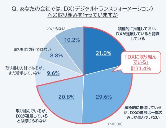 DXへの取り組み状況についての質問では、全体の71.4%が「DXに取り組んでいる」と回答しています。しかしながら、「積極的に推進しており、DXが進展している」と認識しているのはわずか21.0%に留まり、「一部のみしか進んでいない」が約3割、「進展しているとは感じられない」が2割の結果でした。
