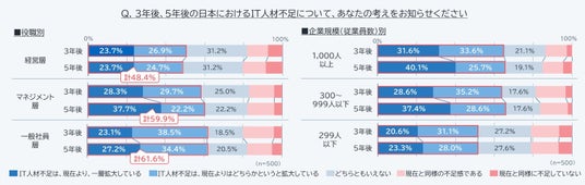 この危機感は、役職や企業規模によって温度差が見られ、5年後の不足拡大を予測する声は、経営層が計48.4%であるのに対し、マネジメント層は計59.9%、一般社員層は計61.6%と、現場に近い層ほど人材枯渇への危機感をより強く肌で感じていることが伺えます。また、5年後にIT人材不足が「一層拡大している」と回答した従業員1,000人以上の大企業は40.1%にのぼり、3年後予測の同31.6%より8.5ポイント増えています。このことから、大企業では将来のIT人材確保に、強い危機感を感じていることが推察されます。