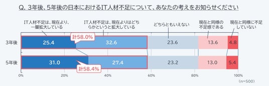 IT人材不足の将来見通しについて、5年後の2030年には計58.4%が「現在よりも不足が拡大する」と考えており、IT人材不足の改善が見通せない状況であることが明らかとなりました。
