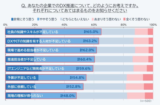 DX推進の課題においては「社員の知識やスキル不足」(65.0%)、「DXやITの知識を有する人材の不足」(63.2%)、「現場の担当者不足」(62.0%)など、人材不足への指摘が多く寄せられました。必要なIT人材が確保できず、結果としてDXが停滞するというジレンマに陥っている企業の実態が明らかになりました。