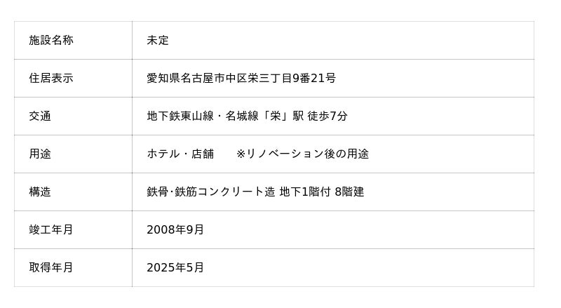 本プロジェクトは、名古屋鉄道グループのデベロッパーである名鉄都市開発株式会社が取得した建物において、2026年春頃の開業を目指し、株式会社ナインアワーズが新規出店するものです。名鉄都市開発が1棟空室の建物を取得してリノベーションを行ったうえで、メインテナントとして建物の約半分をナインアワーズが使用します。なお、名古屋鉄道株式会社は、2025年3月11日に国立大学法人東海国立大学機構名古屋大学と「産学連携に関する協定」を締結し、名古屋・中部圏の発展と地域価値の向上に向けて、名古屋鉄道グループ全体で産業・文化・人材等の様々な交流・共創に取り組んでいます。