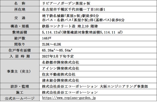 名鉄都市開発株式会社(本社:愛知県名古屋市中村区・代表取締役社長 日比野 博)、アイシン開発株式会社(本社:愛知県刈谷市・代表取締役社長 中村 武司)、住友不動産株式会社(本社:東京都新宿区・代表取締役社長 仁島 浩順)、清水総合開発株式会社(本社:東京都中央区・代表取締役社長 新井田 雅之)は、コカ・コーラボトラーズジャパン事業所跡地開発の第一弾プロジェクトとして、千種区千代田橋一丁目に新築分譲マンション「リピアーノガーデン茶屋ヶ坂」(以下、本計画)について、共同で開発・分譲することを発表いたします。