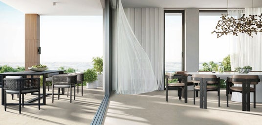 内と外のつながりを感じられるセラミックタイル:リビング ストーン アイボリー GH-AQCF(グリップ)/GH-AQBV(マット)/カーテン:Design Sheer SC7600