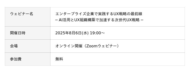 株式会社リオは、UX戦略をテーマにした無料ウェビナーを開催いたします。エンタープライズ規模から中小企業まで、事業会社・支援会社を問わずご活用いただける内容です。