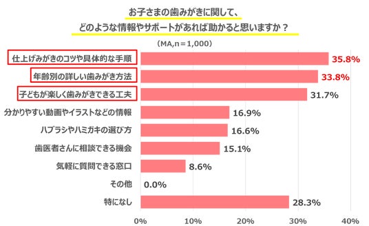 子どもの歯みがきに関して最も知りたい情報について質問したところ、1位「仕上げみがきのコツや具体的な手順」(35.8%)、2位「年齢別の詳しい歯みがき方法」(33.8%)、3位「子どもが楽しく歯みがきできる工夫」(31.7%)が上位となりました。親は、具体的な歯みがきの実践方法や子どもが前向きに取り組めるような工夫など実用的な情報を求めていることが分かります。