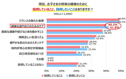 「子どもの将来の健康のためなら、できる限りお金や時間をかけたり、様々な方法を試してあげたいと思いますか?」という質問に対し、約7割(66.0%)が肯定的な回答をしました。また、現在、投資していることは「バランスの取れた食事」(49.0%)に次いで「健康な歯やおくちのためのケア」(40.1%)が2位となり、オーラルケアへの投資意識の高さがうかがえます。また、今後、子どもの将来の健康のために投資したいことについても、現状と同様に「バランスの取れた食事」(48.7%)と「健康な歯やおくちのためのケア」(41.8%)が上位を占めました。オーラルケアを単なるむし歯予防に留まらず、子どもの将来の健康全般にわたる重要な要素として捉えていることが分かります。