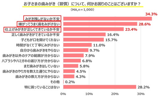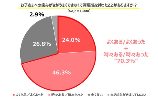子どもの歯みがきがうまくできなくて罪悪感を持ったことがあるかどうか質問をしたところ、約7割(70.3%)の親が「罪悪感」を感じた経験があることが分かりました。子どもの歯みがきに関するお悩みとしては、「みがき残しがないか不安」(34.3%)、「子どもが嫌がってうまく歯をみがけない」(28.6%)、「仕上げみがきが正しくできているか不安」(23.4%)が上位を占めました。技術的な不安(みがき残し、歯みがきの正しい方法)と、歯みがき習慣化の難しさの両面で課題を感じていることが明らかになりました。