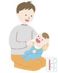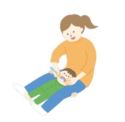 子どもを仰向けに寝かせて大人の両脚で子どもをはさむようにします。子どもの腕を大人の太ももの下にくぐらせると、より安定します。