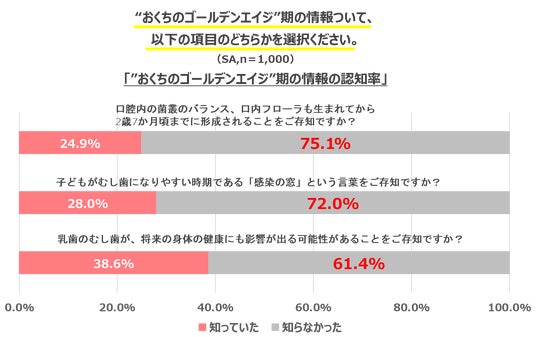 調査の結果、子育てのお悩みとして「おくち周りのケア」が上位であることや、子どもの将来の健康のための投資として「健康な歯やおくちのためのケア」が「食事」に次ぐ2位となるなど、親の子どものオーラルケアに対する関心の高さが明らかになりました。一方で、「感染の窓」や「口内フローラ※の形成」など、0歳~6歳の口腔に関する知識や正しい歯みがき方法については、認知度が低いことも分かりました。