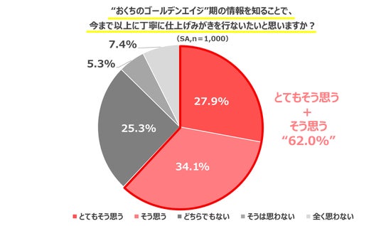 “おくちのゴールデンエイジ”における知識を問う設問で、「乳歯がむし歯になることで、将来の全身の健康に影響する可能性があること」を知っているかという質問をしたところ、「知っていた」と回答した人は4割弱(38.6%)という結果になりました。また、「子どもがむし歯になりやすい時期とされる“感染の窓”」や、「口腔内の菌叢(口内フローラ)が2歳7か月頃までに形成される」ことなど、“おくちのゴールデンエイジ”に関する重要な知識の認知度がいずれも3割程度にとどまり、これまで認識されていなかったことが明らかになりました。しかし、これらの知識を知らなかった人の約6割(62.0%)は、知識を得たことで「今まで以上に丁寧に仕上げみがきを行いたいと思う」と回答しており、正しい情報へのニーズの高さを示しています。