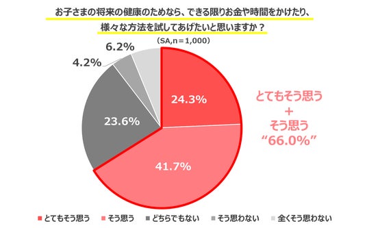 2. 親の約7割(66.0%)が子どもの将来の健康への投資に意欲的。特に力を入れていることの上位は、「食事」や「健康な歯やお口のためのケア」。