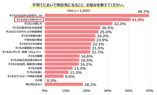 1. 子育てのお悩み1位は「社会的な習慣やしつけ」(49.7%)、2位は「おくち周りのケア」(41.0%)。