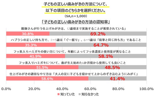 ハブラシの正しい持ち方やフッ素入りハミガキの使用法など5項目について紹介をした上で、正しい歯みがきの方法を知っていたかどうか尋ねたところ、認知度が最も低かった項目は、「仕上げみがきは、12歳頃まで実施することが推奨されている」でした。回答者の約7割(69.2%)がこの推奨期間を「知らなかった」と回答し、永久歯が生え揃う12歳まで長期にわたり親の仕上げみがきのサポートが必要であることが、広く認識されていないことが明らかになりました。他にも、年齢別のハブラシの正しい持ち方や、フッ素入りハミガキの年齢に応じた濃度や使用量についても、約6割の親が「知らなかった」と回答しており、全体的な知識不足が分かりました。