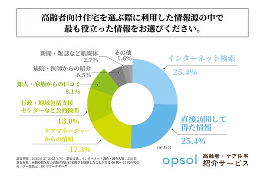 次に、両親や祖父母の最初の高齢者向け住宅を自分で探して選んだと回答した人を対象に「高齢者向け住宅を選ぶ際に利用した情報源の中で最も役立った情報」を尋ねる設問への回答では、1位が同率で「インターネット検索」と「直接訪問して得た情報」で25.4%、3位が「ケアマネージャーからの情報」で17.3%という結果になりました。この結果から、両親や祖父母の最初の高齢者向け住宅を自分で探して選んだ人が、高齢者向け住宅を選ぶ際に最も役立った情報源は、「インターネット検索」と「直接訪問して得た情報」であることがわかりました。