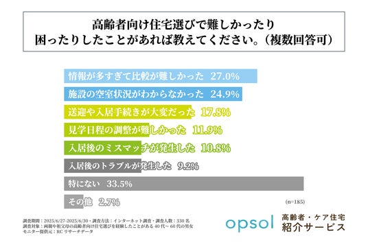 また、両親や祖父母の最初の高齢者向け住宅を自分で探して選んだと回答した人を対象に「高齢者向け住宅選びで難しかったり困ったりしたこと」を尋ねる設問への回答では、1位が「特にない」で33.5%、2位が「情報が多すぎて比較が難しかった」で27.0%、3位が「施設の空室状況がわからなかった」で24.9%という結果になりました。この結果から、高齢者向け住宅選びで難しかったり困ったりしたことは「特にない」という人が最も多かったものの、「情報が多すぎて比較が難しいこと」や「施設の空室状況がわからないこと」に困難を感じた人も一定数いることが明らかになりました。