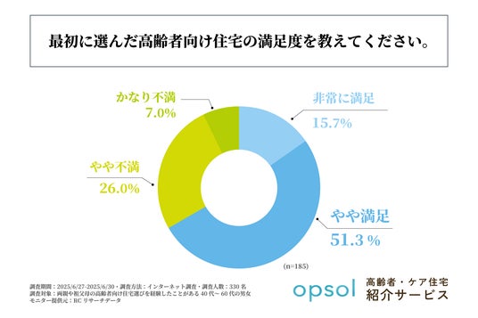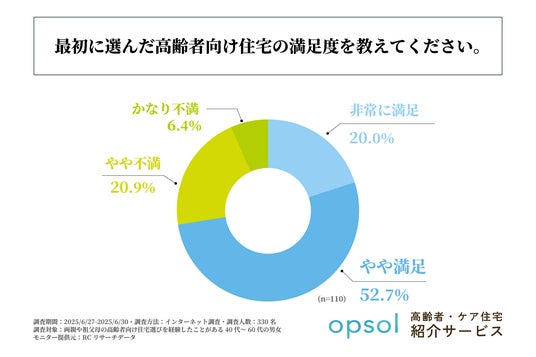 両親や祖父母の最初の高齢者向け住宅を自分で探して選んだ人の約65%が、選んだ高齢者向け住宅に少なからず満足している