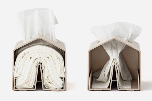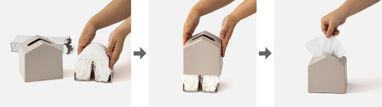 一般的なサイズのティッシュペーパーを箱から出し、二つ折りにして乗せ、上から本体を被せるだけ。容量はそのままに省スペースでコンパクト。分かりやすい動作で簡単に詰め替えができるように工夫しました。