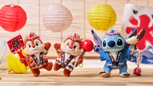 日本のお祭りがテーマのドナルド、チップ、デール、スティッチ、ベイマックスのぬいぐるみキーチェーンが登場します。はっぴを身にまとい、うちわやりんご飴、チョコバナナなど、お祭りならではのモチーフを手にした愛らしい姿にご注目ください。バッグなどにつけて、夏のイベントやおでかけを一層楽しく演出します。