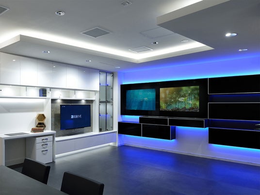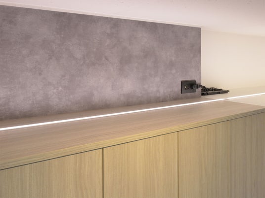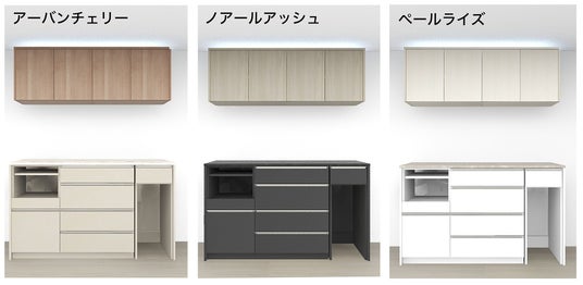カップボードはオープンスペースにあることが多く、インテリアとしても美しくみせるために、吊戸棚の上にLED照明を配置。