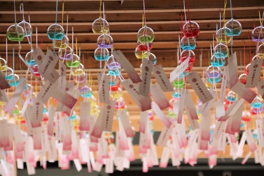 境内の絵馬殿に飾られた約2,000個の風鈴が、風とともに澄んだ音色を響かせます。一つひとつの風鈴には願い札が結ばれ、祈りが込められています。
