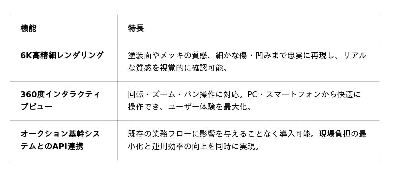 本導入は、BDSが展開するプレミアム出品車両を対象に、6K高精細 × 360度インタラクティブビューによる可視化を実現したもので、BDSのオークション基幹システムとAPI連携によりスムーズな統合がなされました。閲覧者はWebブラウザ上で、出品車両を360度自由に回転・ズーム・パン操作しながら確認でき、オンライン上でも現車確認に極めて近い体験が可能となります。