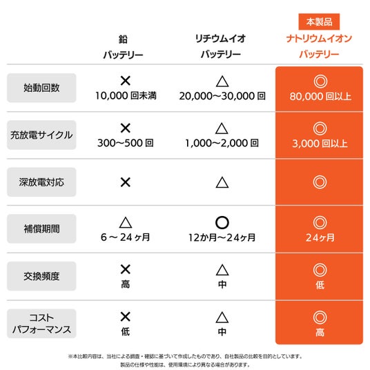 - 10年間での交換回数は1回程度※(鉛バッテリーの約1/3)