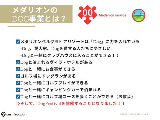 【CarLifeJapan事務局コメント】 CarLifeJapan 野瀬 勇一郎: 「メダリオン・ベルグラビアに最初にうかがったときの胸の高鳴りを思い出します。ゴルフ場ってこんなにもわんちゃんとの相性が良いのだろうか。このことをイベントを通じて、愛犬家の皆さんに知っていただきたいと思います。そして、ゴルフ業界内外に新たな印象を与えられることを目指しています。」