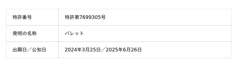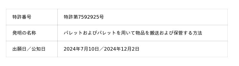 当社は、ユニットロードシステムのコア技術である回転式パレット「Vパレ(TM)」の構造について、3件の特許を取得しました。この回転式パレットは、当社ロジスティクス部門の社員が「搬送時と保管時における商品の積み方を変えられるパレット構造」というアイデアを考案したことが導入のきっかけとなっています。2つの底面にフォークリフトのフォーク挿入孔を備えた設計により、「パレット積み・パレット降ろし」を実現し、効率的かつ安全な物流システムを構築します。なお、これら3件の特許は補完関係にあり、当社は今後も知的財産に関して強固なポートフォリオを築いてまいります。【回転式パレット「Vパレ(TM)」に関する3件の特許】