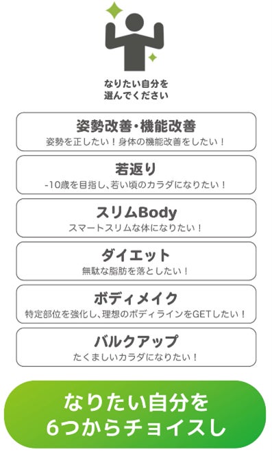 「AI顔認証型体組成計」で現在の身体状態を自動で取得。「なりたい自分」を6つから選びライフスタイルの条件を入力するだけで、簡単にあなただけの運動メニューが提案されます。