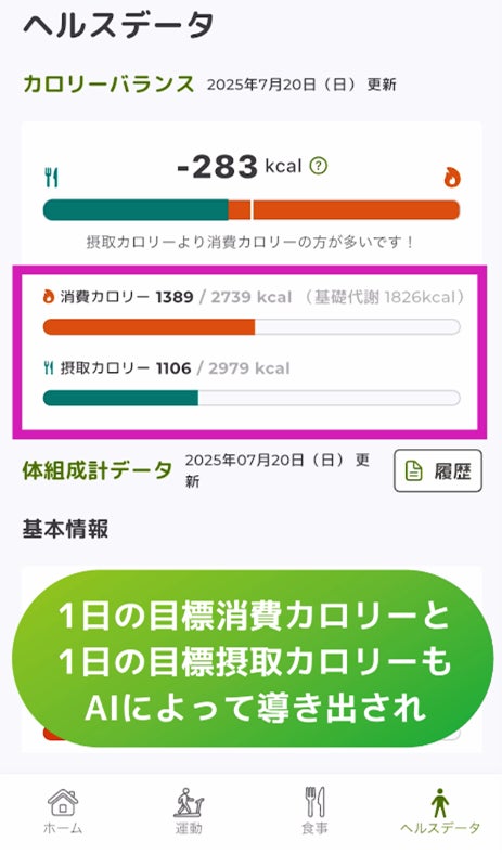 目標消費カロリーと目標摂取カロリーを自動でデータ化し、あなたに最適なカロリーバランスを提供。