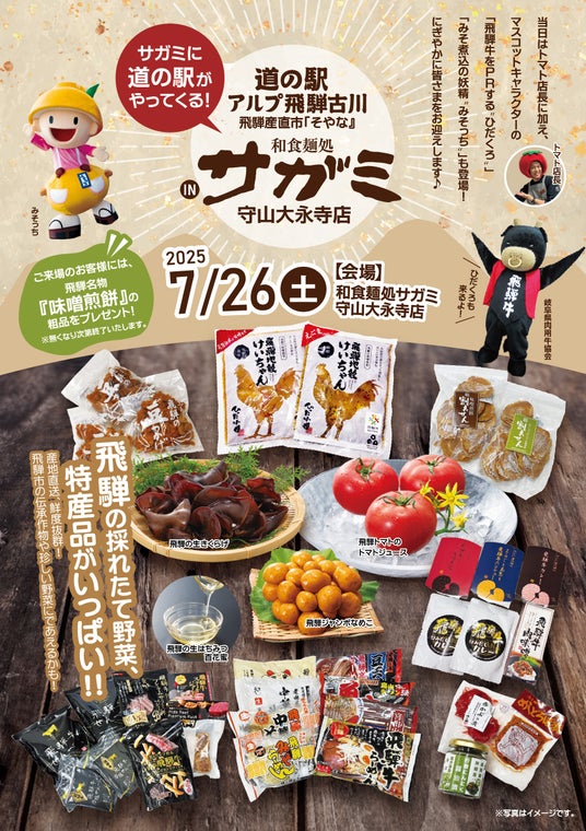 「道の駅アルプ飛騨古川」の飛騨産直市そやなは、飛騨の野菜や果物、特産品やお酒などを販売しており、夏場は毎日飛騨の新鮮な野菜を購入することができます。今回は1日限定で和食麺処サガミで出張販売をします。トマト店長やマスコットキャラクター「飛騨牛をPRする“ひだくろ”」「みそ煮込の妖精“みそっち”」がお迎えします。