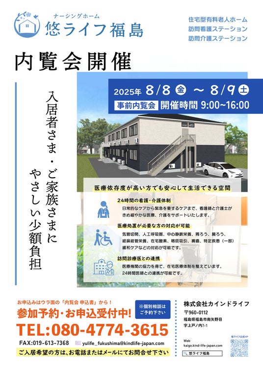 株式会社カインドライフは、2025年9月、福島県福島市に新たな住宅型有料老人ホーム「ナーシングホーム悠ライフ福島」(福島県福島市南矢野目上戸ノ内7-1)をオープンします。