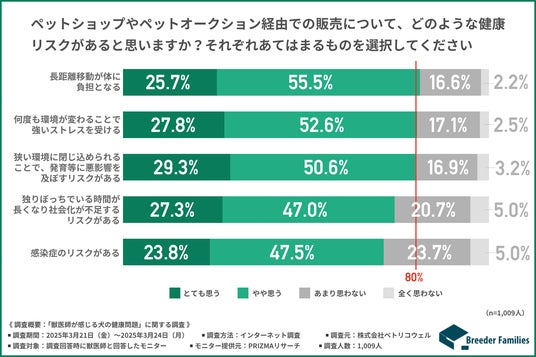 さらに、8割近い獣医師が「長距離移動による身体的負担」や「繰り返される環境の変化による強いストレス」「狭い環境での発育不良のリスク」など、具体的な健康リスクを強く問題視しています。