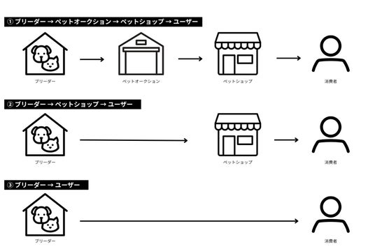 【1. ブリーダー → ペットオークション → ペットショップ → ユーザー】