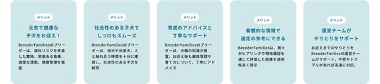 BreederFamiliesでは、上記のようなペットショップやペットオークションを利用しない等アニマルウェルフェアの観点で厳しい基準をクリアした優良ブリーダーのみ掲載しています。